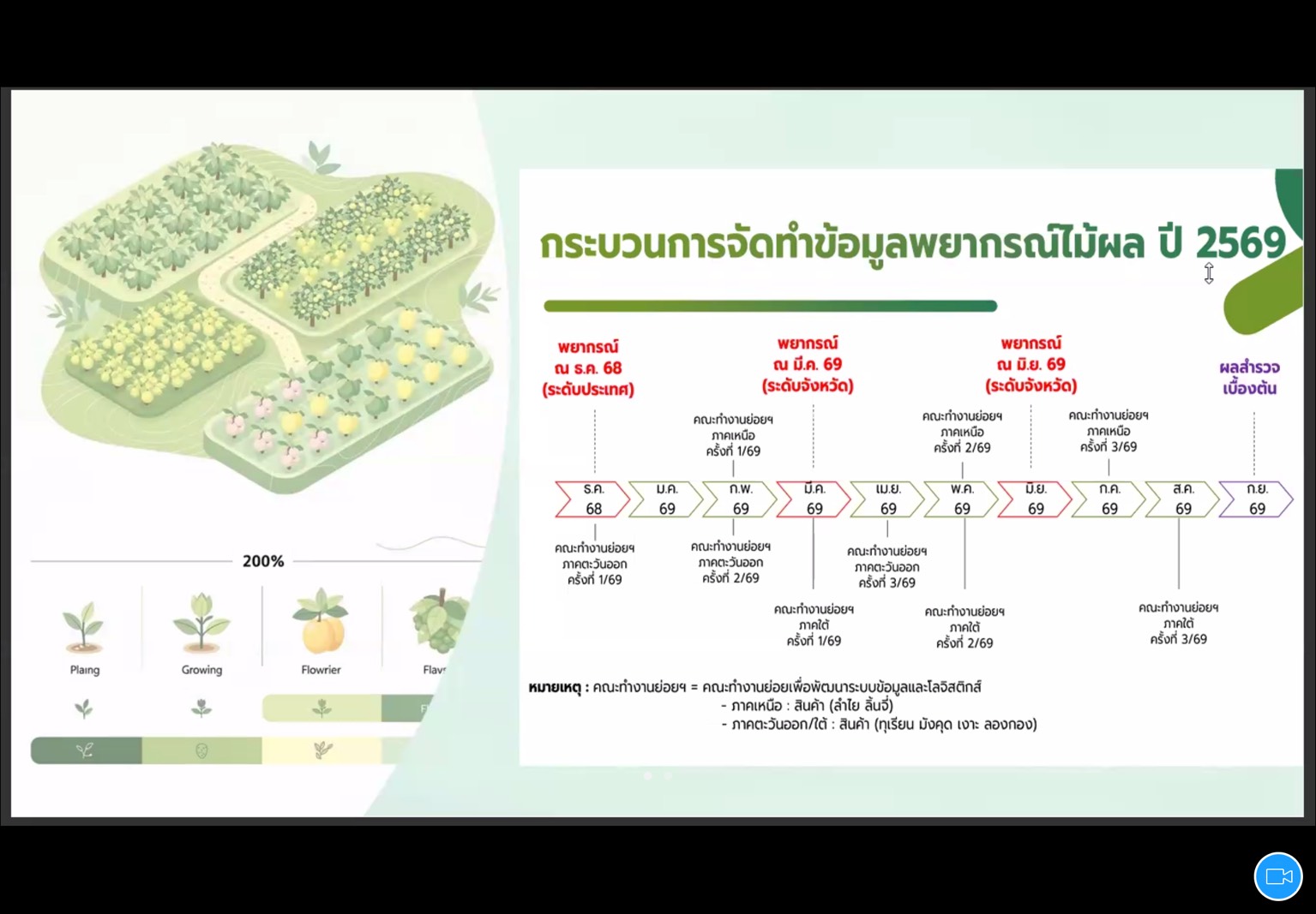 ไม้ผลเศรษฐกิจภาคเหนือ ปี 2569 เพื่อสนับสนุนการบริหารจัดการไม้ผลเศรษฐกิจอย่างเป็นระบบ” ครั้งที่ 1 เพื่อรับฟังการนำเสนอการประยุกต์ใช้โมเดลพยากรณ์ผลผลิตกับการติดตามสถานการณ์การผลิตแบบเร่งด่วน ทบทวนคำนิยามและกรอบแนวคิดของการจัดทำข้อมูลเนื้อที่ยืนต้น เนื้อที่ให้ผลผลผลิต และผลผลิตต่อไร่ รายงานสถานการณ์การผลิตไม้ผล (ลำไย ลิ้นจี่ ทุเรียน มะม่วงน้ำดอกไม้) และร่วมอภิปรายเพื่อประมาณการผลผลิต สรุปผลและจัดทำข้อมูลประมาณการผลผลิต และร้อยละการเก็บเกี่ยวผลผลิตไม้ผลรายเดือน ปี 2569 ผ่านระบบออนไลน์ Zoom Meeting