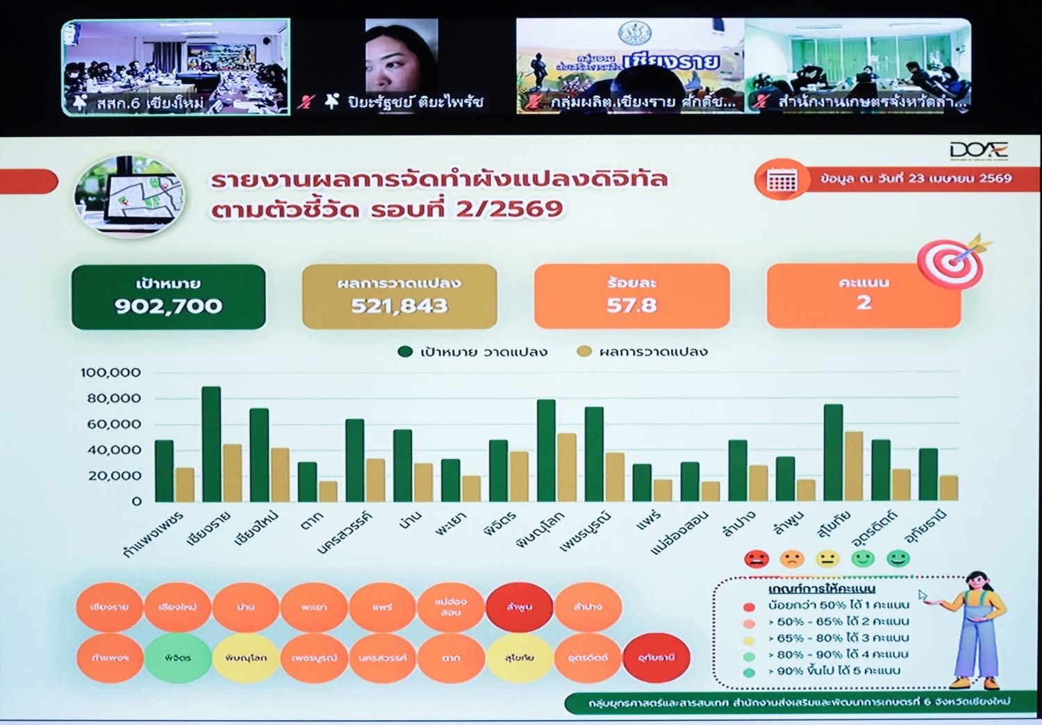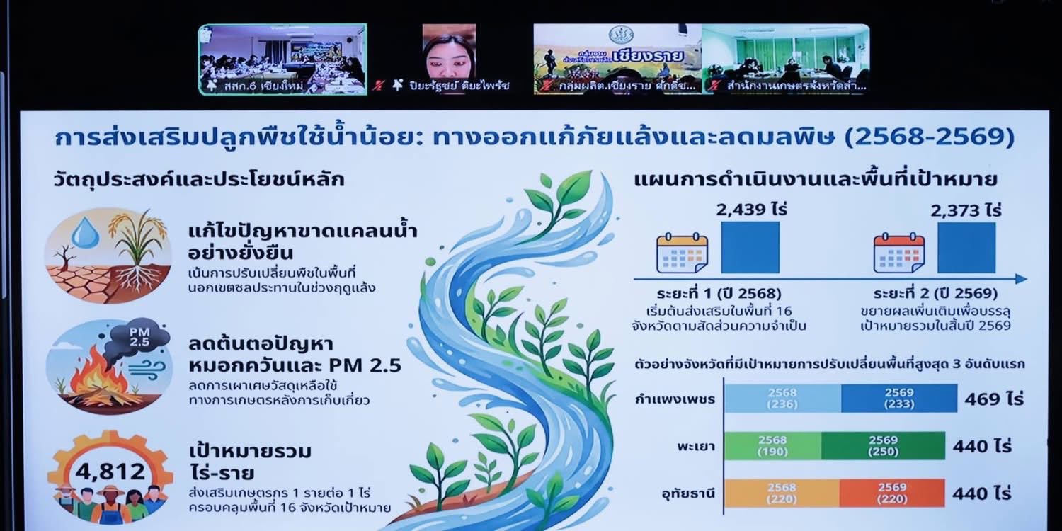 วันที่ 23 เมษายน 2569 นายพยุงศักดิ์ สิทธิลภ เกษตรจังหวัดแม่ฮ่องสอน เข้าร่วมประชุมเกษตรจังหวัดและหัวหน้าส่วนราชการระดับเขต ผ่านระบบ Zoom Meeting โดยมีนายสุริยะ คำปวง รองอธิบดีกรมส่งเสริมการเกษตร เป็นประธานการประชุม เพื่อติดตามการดำเนินงานและผลการปฏิบัติงานของสำนักงานเกษตรจังหวัดและศูนย์ปฏิบัติการ ในการประชุมมีการรายงานสถานการณ์และประเด็นสำคัญ ได้แก่ สถานการณ์การเพาะปลูกพืชฤดูแล้งและการคาดการณ์พื้นที่เสี่ยงภัยแล้ง สถานการณ์ไฟป่า หมอกควัน และฝุ่นละอองในภาคการเกษตร สถานการณ์การผลิตไม้ผลเศรษฐกิจสำคัญของภาคเหนือ ได้แก่ ลิ้นจี่ ลำไย มะม่วง และทุเรียน รวมถึงสถานการณ์การผลิตสับปะรดพันธุ์ปัตตาเวีย นอกจากนี้ ยังมีการรายงานความก้าวหน้าการให้ความช่วยเหลือเกษตรกรผู้ประสบภัยพิบัติด้านพืชจากเหตุอุทกภัยในช่วงฤดูฝนที่ผ่านมา ตลอดจนรายงานความเสียหายจากสถานการณ์พายุฤดูร้อน และสถานการณ์การระบาดของโรคและแมลงศัตรูพืชในพื้นที่ภาคเหนือตอนบนและตอนล่าง